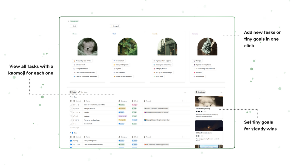 When life’s too busy for complicated planners, make it easy with one-click task adds, and kaomoji that make every task a little more fun. Simple, ready, and built to fit everything—from daily to-dos to your biggest goals.