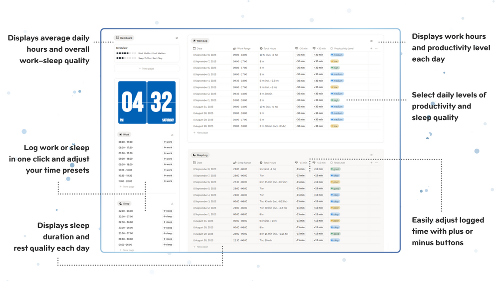 When the day feels unbalanced between work and rest, track your work hours and sleep hours, log sessions with just a few clicks, and see how productivity and recovery fit together — complete with simple tools that make balance easy to follow. Practical and designed to keep both focus and rest in one place.